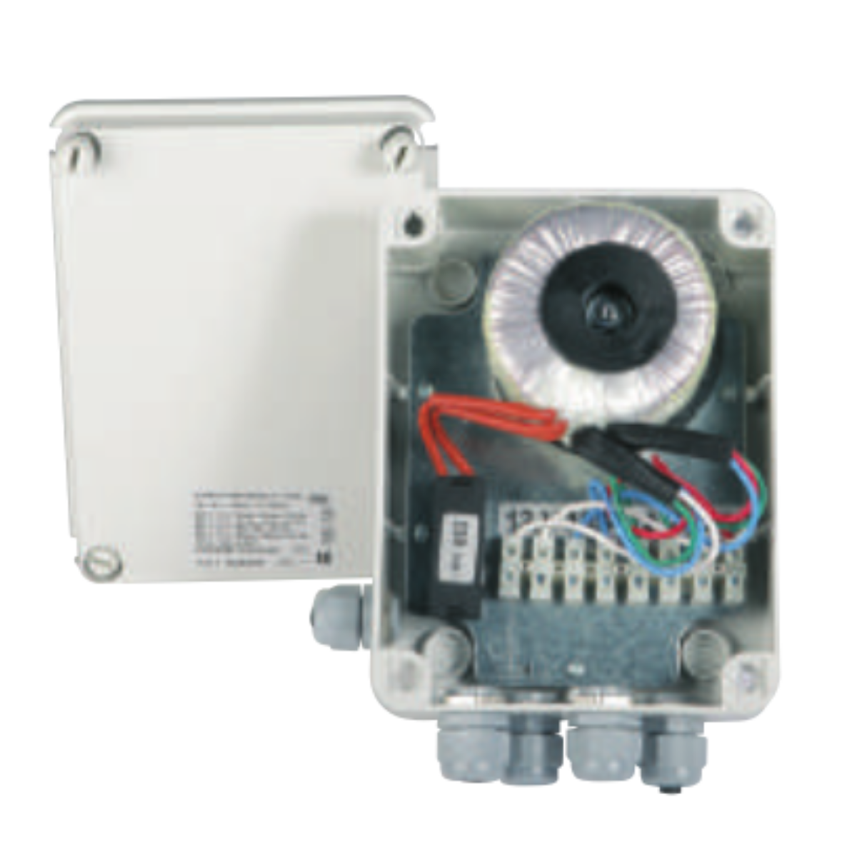 Trasformatore con cassetta a parete stagna a pareti lisce in Gwplast 75° color grigio con coperchio cernierato con viti speciali in nylon piombabili complete di staffe di fissaggio a parete senza pregiudicare il grado di protezione IP, secondo le norme IEC 60670-CEI 23-48.
